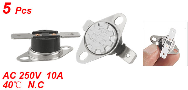 Product Name Temperature Switch Model.No KSD301 Action Type Normal Close(NC) Action Temperature 40C/104F Voltage 250V 10A Circuit Resistance <50 Mohm Insulation resistance 100 Mohm Size(Each) 3.4 x 1.2cm/1.3" x 0.47"(L*H) Material Metal, Plastic Color Black, Silver Tone Net Weight 24g Package Content 5 x Temperature Switch Themostat - Reviews