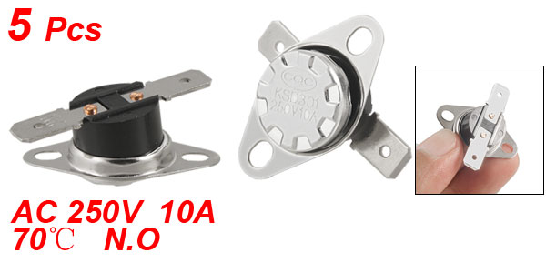 Product Name Temperature Switch Model.No KSD301 Action Type (NO)Normal Open Action Temperature 70C/158F Voltage 10A, AC250V Circuit Resistance <50 Mohm Insulation resistance 100 Mohm Size(Each) 3.4 x 1.2cm/1.3" x 0.47"(L*H) Material Metal, Plastic Color Black, Silver Tone Net Weight 24g Package Content 5 x Temperature Switch Themostat - Reviews