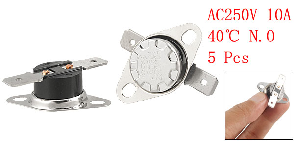 Product Name Temperature Switch Model.No KSD301 Action Type (NO)Normal Open Action Temperature 40C/104F Voltage 10A, AC250V Circuit Resistance <50 Mohm Insulation resistance 100 Mohm Size(Each) 3.4 x 1.2cm/1.3" x 0.47"(L*H) Material Metal, Plastic Color Black, Silver Tone Net Weight 24g Package Content 5 x Temperature Switch Themostat - Reviews