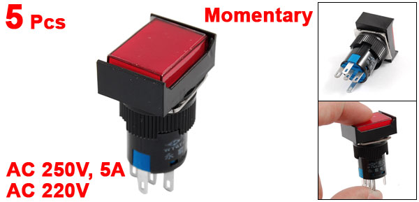 5 x Momentary 1NO 1NC AC 220V Red Neon Light Rectangle Push Button Switch