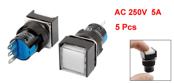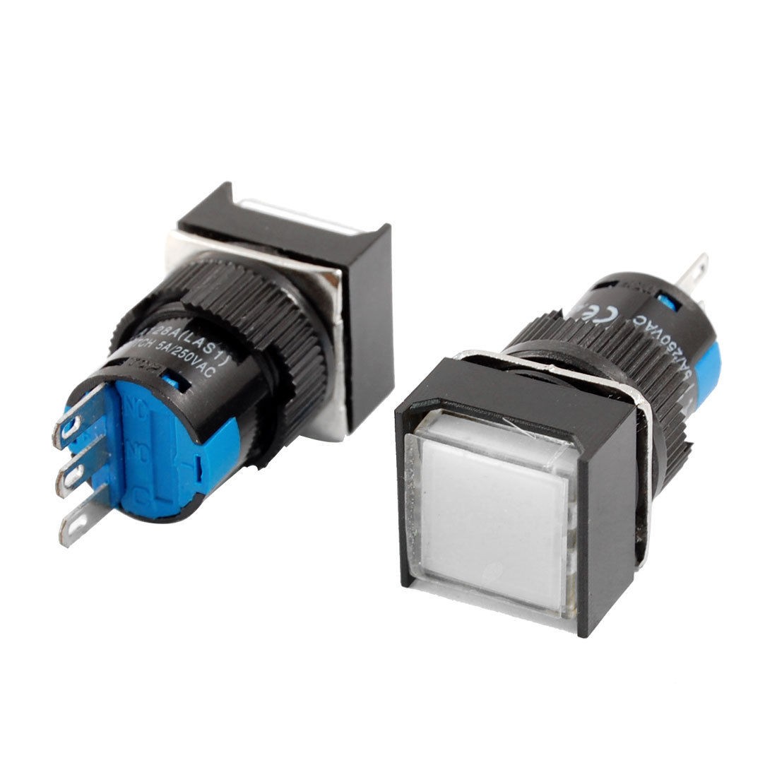 Item Name Push Button Switch Type Momentary, 1NO 1NC Ith AC 220V, 5A Voltage AC 250V, 5A Button Color White Button Size 15 x 15mm/0.6'' x 0.6''(L*W) Thread Diameter 15.6mm/0.61'' Size 17 x 17 x 38mm/0.7'' x 0.7'' x 1.5''(L*W*H) Material Plastic, Metal Weight 32g Package Content 1 x Push Button Switch - Reviews