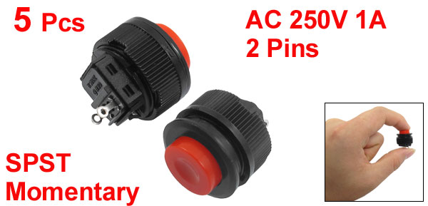 Product Name Push Button Switch Action Type Momentary Contact Type NO Poles SPST Rating Voltage AC 250V 1A Terminals Quantity 2 Pins Mounting Thread Dia. 15.5mm / 0.61" Button Dia. 11mm/ 0.43" Terminals Pitch 4mm / 0.16" Overall Size 20 x 18mm / 0.8" x 0.7"(Max. L * D) Material Plastic & Metal Color Red, Black, Silver Tone Weight 16g Package Content 5 x Push Button Switch - Reviews