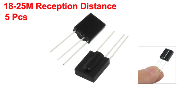 Product Name Infrared Remote Control Receiver Module Model Number PIC-0038A2-B Working Voltage 5V Reception Distance 18-25M Body Size 12.6 x 10 x 5.5mm / 0.5" x 0.4" x 0.22"(L*W*T) Pin Length 18mm / 0.7" Pin Pitch 2.5mm / 0.1" Material Plastic, Alloy Color Black, Silver Tone Weight 6g Package Content 5 Pcs x Infrared Remote Control Receiver Modules - Reviews