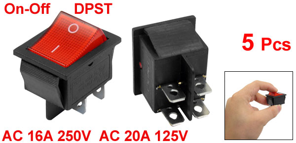 Terminals 4 Pins Position On-Off Lamp Color Red Rated Voltage AC 16A 250V, AC 20A 125V Overall Size 31 x 25 x 35mm / 1.2" x 1" x 1.4" (L*W*H) Mounting Size 27 x 21mm / 1.1" x 0.8" (L*W) Color Black, Red Material Plastic, Metal Total Weight 59g Package Content 5 x Rocker Switches - Reviews
