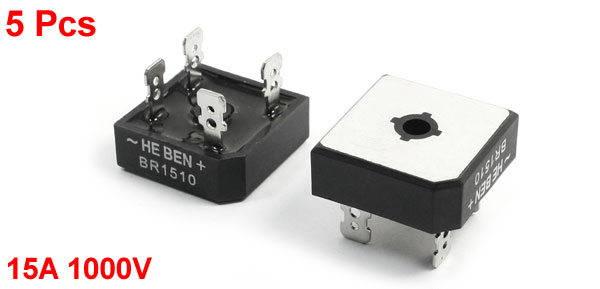 Product Name Bridge Rectifier Model KBPC1510 Forward Current 15A Repetitive Reverse Voltage 1000V Terminal Size 11 x 6.5mm/ 0.43" x 0.25"(L*W) Body Size 29 x 29 x 11mm/ 1.1" x 1.1" x 0.43" (L*W*T) Mounted Hole Dia. 5mm/ 0.2" Material Resin, Metal Color Silver Tone, Black Net Weight 94g Package Content 5 x Single Phase Bridge Rectifier - Reviews