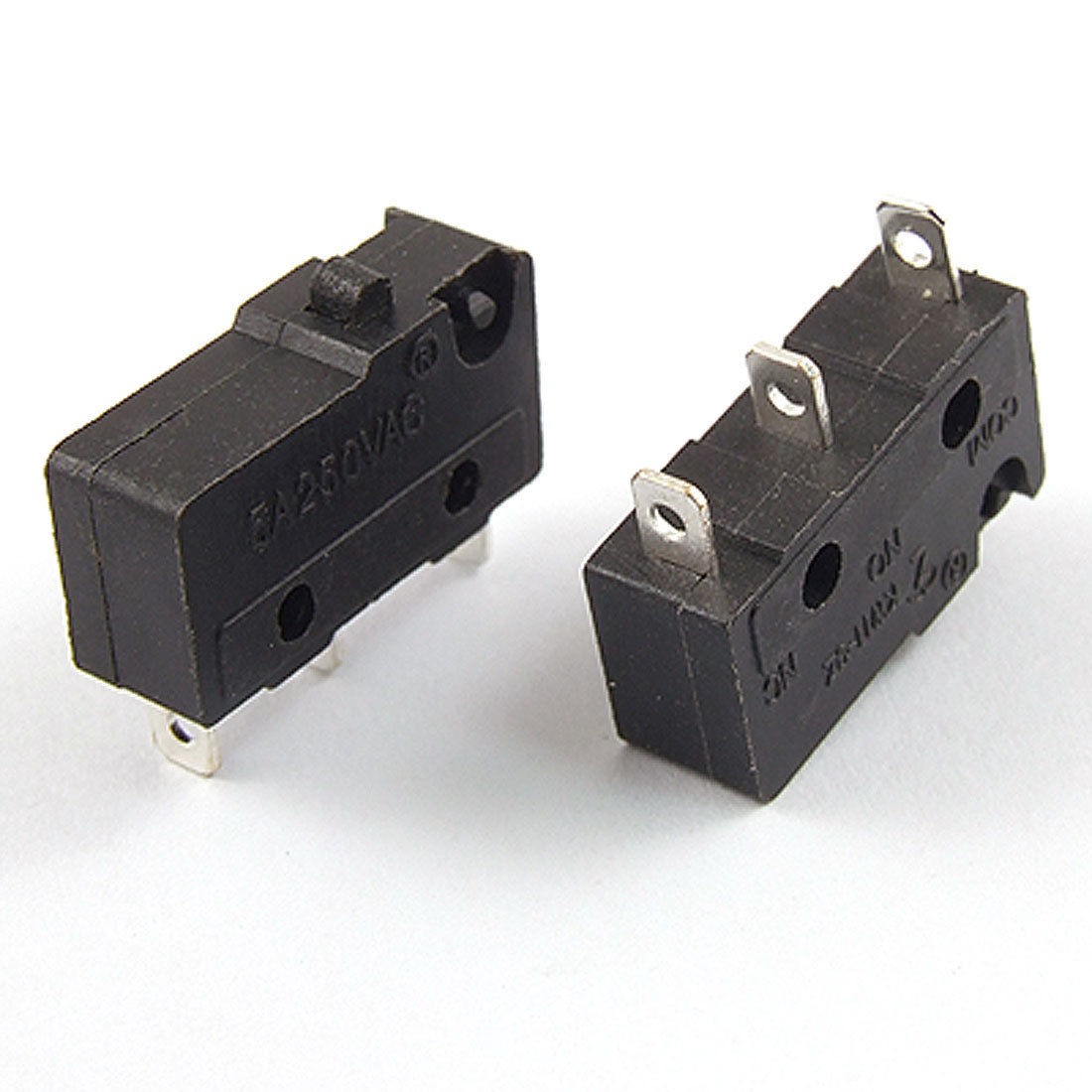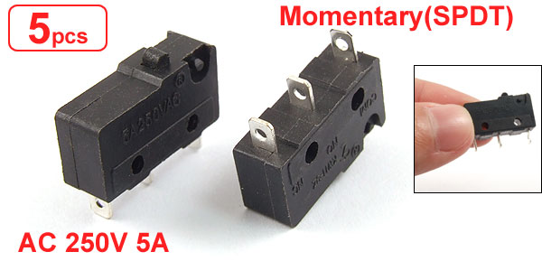 Product Name Micro Switch Voltage & Current AC 250V 5A Poles SPDT Contact Type 1NO + 1NC Action Type Momentary Actuator Type Push Button Terminal Type 3-Pin Terminals Overall Size 2 x 0.65 x 1.4cm / 0.8" x 0.3" x 0.6" (L*W*H) Mounting Hole Dia. 2mm / 0.08" Mounting Hole Spacing 1cm / 0.39" Pin Pitch 7.2 x 8.8mm / 0.28" x 0.35" Push Button Size 2 x 1.5mm / 0.08" x 0.06" (L*W ) Material Plastic, Metal Color Black, Silver Tone Total Weight 11g Package Content 5 x Micro Switches - Reviews