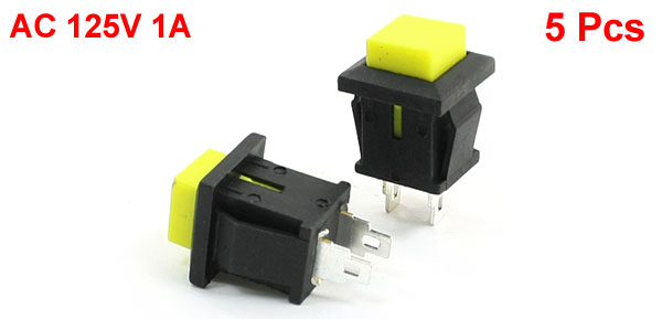 Item Name Push Button Switch Control Type Momentary, SPST Voltage AC 125V 1A Color Yellow, Black Pin Pitch 6.5mm/ 0.26" Button Size 9 x 9mm/ 0.35" x 0.35" (L*W) Total Size 14 x 14 x 25mm/ 0.55" x 0.55" x 1"(L*W*H) Material Plastic, Electric Parts Net Weight 20g Package Content 5 x Push Button Switch - Reviews