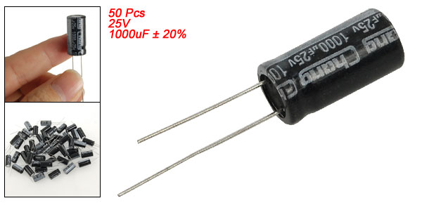 Product Name Aluminum Electrolytic Capacitor Type Radial Lead Quantity 50 ± 2%Pcs Maximum Temperature 105°C Voltage 25V Capacitance 1000uF Capacitance Tolerance ±20% Body Size 10 x 20mm/ 0.39'' x 0.78'' (D*L) Lead Spacing 4mm/ 0.16'' Lead Length 27mm/ 1.06'', 21mm/ 0.82'' External Material Aluminum Weight 117g Color As Picture Shown Package Content 50 Pcs x Electrolytic Capacitors - Reviews