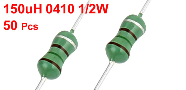 Product Name Fixed Inductor Lead Type Axial Power Rating 1/2W Packaging Type 0410 Inductance Tolerance ± 10% Inductance 150uH Total Size (Approx) 6 x 0.35cm / 2.4" x 0.14" (L*D) Main Color Green, Silver Tone Weight 17g Package Content 50(+/-2%) Pcs x Fixed Inductor - Reviews