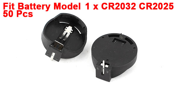 Details50 Pcs 2 Pins CR2032 CR2025 Coin Cell Button Battery Socket Holder Case Black  Product Name Button Battery Holder Fit Battery Model 1 x CR2032 CR2025(Not Included Here) Material Plastic, Metal Body Size 22 x 9mm / 0.9" x 0.35"(Max. D*H) Inner Diameter 20mm / 0.8" Pin Distance 20mm / 0.8" Color Black Net Weight 88g Package Content 50(±2%) x Button Battery Holder