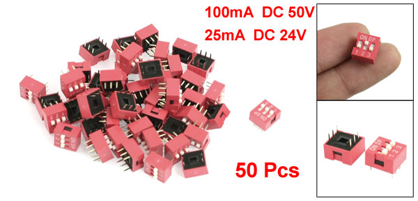 Product Name DIP Switch Type 3 Position Slide Type Poles 2 x 3 Pins(2 rows) Pitch 2.54mm Non-Switching Rating 100mA DC 50V Switching Rating 25mA DC 24V Dimension 1 x 1 x 1cm/ 0.4" x 0.4" x 0.4"(L*W*H) Material Plastic, Electric Parts Main Color Red Weight 45g Package Content 50 Pcs x DIP Switches - Reviews