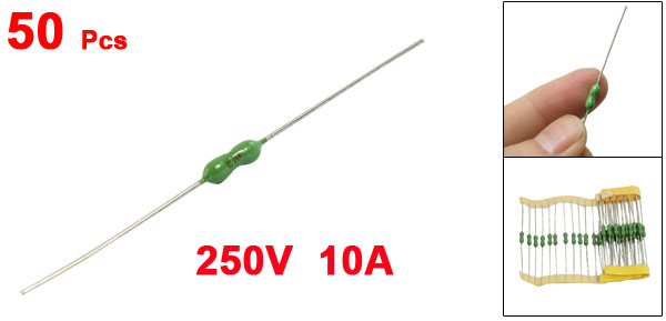 Product Name Pico Fuse Material Resin, Metal Type Quick Acting Blow out Voltage 250V Blow out Current 10A Mounting Type Through Hole Lead Style Axial Resin Part Size 8 x 2.7mm/ 0.31" x 0.11"(L*D) Each Lead Size 27 x 0.5mm/ 1.06" x 0.02" (L*D) Total Length 63mm/ 2.5" Quantity 50 ± 2% Pcs Weight 14g Package 50 x Pico Fuse - Reviews