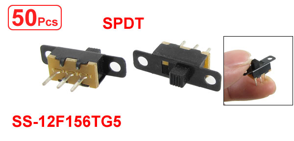 Product Name Slide Switch Model SS-12F156TG5 Type 1 Pole 2 Throw Terminal Quantity 3 Working Power 0.5A 50V DC Contact Resistance 30mΩ Max Insulation Resistance 100mΩ Min at 500V DC Withstand Voltage AC 500V for 1 min Terminal Length 5mm/ 0.2" Overall Size 19 x 5 x 13mm/ 0.75" x 0.2" x 0.51"(L*W*H) Knob Size 3 x 3 x 4mm/ 0.12" x 0.12" x 0.16"(L*W*H) Material(External) Plastic, Metal Main Color Silver Tone, Black Weight 39g Package Content 50 Pcs(±2%) x Slide Switch - Reviews