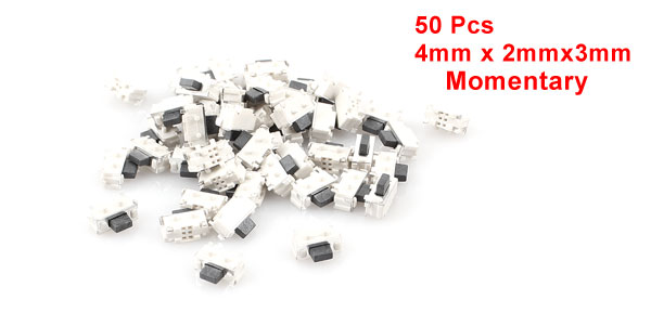 Product Name Tact Switch Acuion Type Momentary Switch Size 4 x 2 x 3mm / 0.16" x 0.08" x 0.1"(L*W*T) Material Plastic, Metal, Electric Parts Color White, Black Weight 3g Package Content 50 x Tact Switches - Reviews