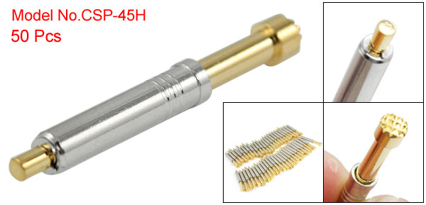 Product Name Test Probe Pin Model No. CSP-45H Tip Type 16 Point Serrated Tip Tip Diameter (Approx) 5mm/ 1/5" Barrel Dia (Approx) 4.5mm/ 3/16" Overall Length (Approx) 39.7mm/ 1 3/5" Color Gold Tone & Silver Tone Net Weigth 188g Package Content 50 Pcs x Test Probe Pin - Reviews