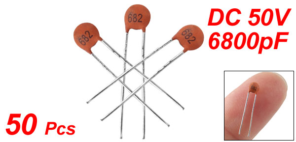 Product Name Ceramic Disc Capacitor Features Low Voltage Withstand Voltage DC 50V Capacitance 6800pF Capacitance Tolerance +80%-20% Lead Pitch Spacing 2.5mm / 0.1'' Body Dimension(Each) 3 x 1.5mm / 0.1" x 0.05"(D*T) Weight 3g Color As Picture Show Package Content 50 (± 2%) x Ceramic Disc Capacitors - Reviews