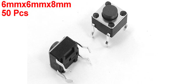 Product Name Tactile Push Button Switch Contact Type Momentary Switch Dimension (Approx.) 6 x 6 x 8mm / 0.24" x 0.24" x 0.31" (L*W*H) Button Diameter 3mm/ 0.12" Mounting Pin Pitch 6 x 4mm/ 0.24" x 0.16"(L*W) Mounting Pin Length 4.3mm/ 0.17" Material Plastic, Metal Color Black, Silver Tone Net Weight 14g Package Content 50 x Tactile Push Button Switch - Reviews