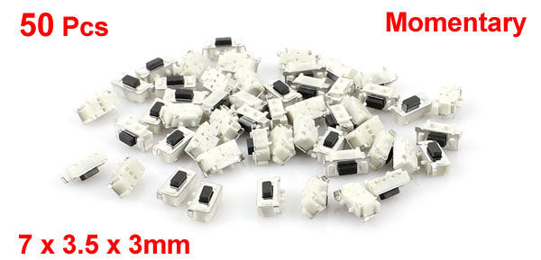 Product Name Tact Switch Acuion Type Momentary Switch Size 7 x 3.5 x 3mm / 0.3" x 0.1" x 0.1"(L*W*T) Pin Spacing 3.5mm/0.1" Material Plastic, Metal, Electric Parts Color White, Black Weight 7g Package Content 50 x Tact Switches - Reviews