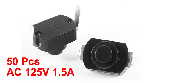 Details50 Pcs AC 125V 1.5A Vertical 2 Pins Latching Torch Push Button Switch  Product Name Torch Push Button Switch Contact Type Latching Contact Voltage/ Current AC 125V 1.5A Pin Number 2(Single Row) Terminal Driection Vertical Overall Size 12 x 8 x 4mm/ 0.5" x 0.31" x 0.16" (L*W*H) Button Diameter 4mm/ 0.16" Material Plastic, Metal, Electric Parts Color Black, Silver Tone Weight 37g Package Content 50 x Torch Push Button Switch