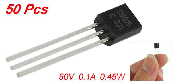 Product Name PNP Silicon Transistor Quantity 50±2% Pcs Model S9015 Package TO-92 Collector Base Voltage 50V Collector Current 0.1A Collector Dissipation 0.45W Pin Size 14 x 1mm/ 0.55" x 0.039" ( L* Pitch) Body Dimension 18 x 4 x 3mm/ 0.7" x 0.16" x 0.12" (L*W*T) Weight 11g Package Content 50 x Silicon PNP Transistor - Reviews