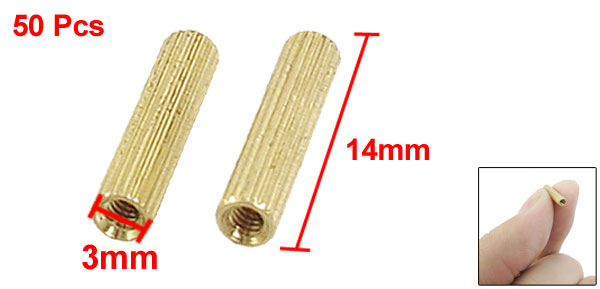 Product Name Brass Standoff Spacer Thread Size M2 Female Total Size(Approx.) 14 x 3mm/ 0.55" x 0.12" (L*Max.D) Material Brass Color Gold Tone Net Weight 29g Package Content 50 x Brass Standoff Spacer - Reviews