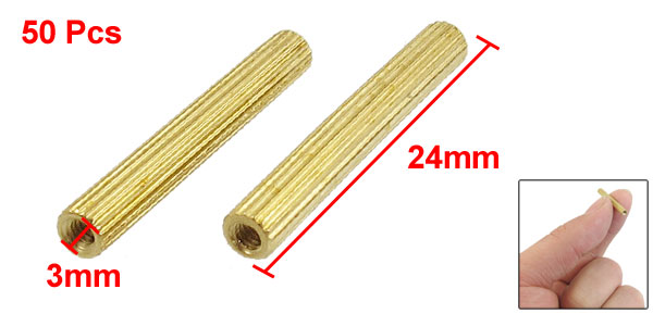 Product Name Brass Standoff Spacer Thread Size M2 Female Total Size(Approx.) 24 x 3mm/ 0.94" x 0.12" (L*Max.D) Material Brass Color Gold Tone Net Weight 51g Package Content 50 x Brass Standoff Spacer - Reviews