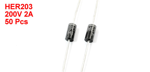 Product Name High Efficiency Rectifier Diode Model HER203 Forward Current 2A Max Peak Reverse Voltage 200V Lead Size 0.7 x 26mm/ 0.01" x 1"(D*L) Body Size 3 x 6.5mm/ 0.12" x 0.25" (D*L) Main Color Black, Silver Tone Weight 16g Package Content 50 Pcs(±2%) x High Efficiency Rectifier Diodes - Reviews
