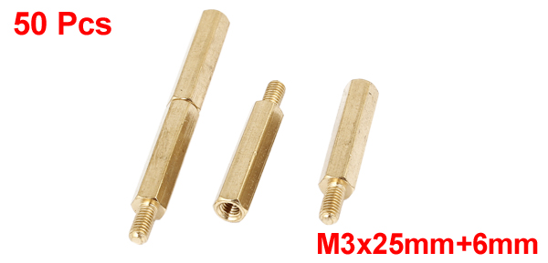 Product Name Hexagonal Threaded Spacer Thread Size M3 Thread Length 6mm / 0.24" Tube Length 25mm / 0.98" Total Size 31 x 4.5mm / 1.2" x 0.18" (H*D) Material Brass Color Gold Tone Net Weight 160g Package Content 50 Pcs (±2%) x Hexagonal Threaded Spacer - Reviews