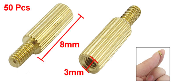 Product Name Brass Pillars Standoff Thread Size M2 Male x M2 Female Male Thread Length 3mm/ 0.12" Body Length 8mm/ 0.315" Total Size(Approx.) 11 x 3mm/ 0.43" x 0.12" (L*Max.D) Material Brass Color Gold Tone Net Weight 23g Package Content 50 x Brass Pillars Standoff - Reviews