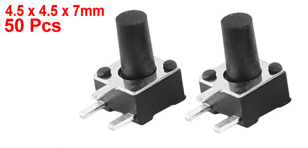 Product Name Tact Switch Type SPST Action Type Momentary Dimension 4.5 x 4.5 x 7mm / 0.18" x 0.18" x 0.28"(L*W*H) Button Dia 2mm / 0.08" Pin Length 1.5mm/0.06" Pin Spacing 3 x 2.5mm/0.12" x 0.1"(L*W) Material Plastic, Metal, Electric Parts Color Black, Silver Tone Net Weight 8g Package Content 50(±2%) x Tact Switch - Reviews