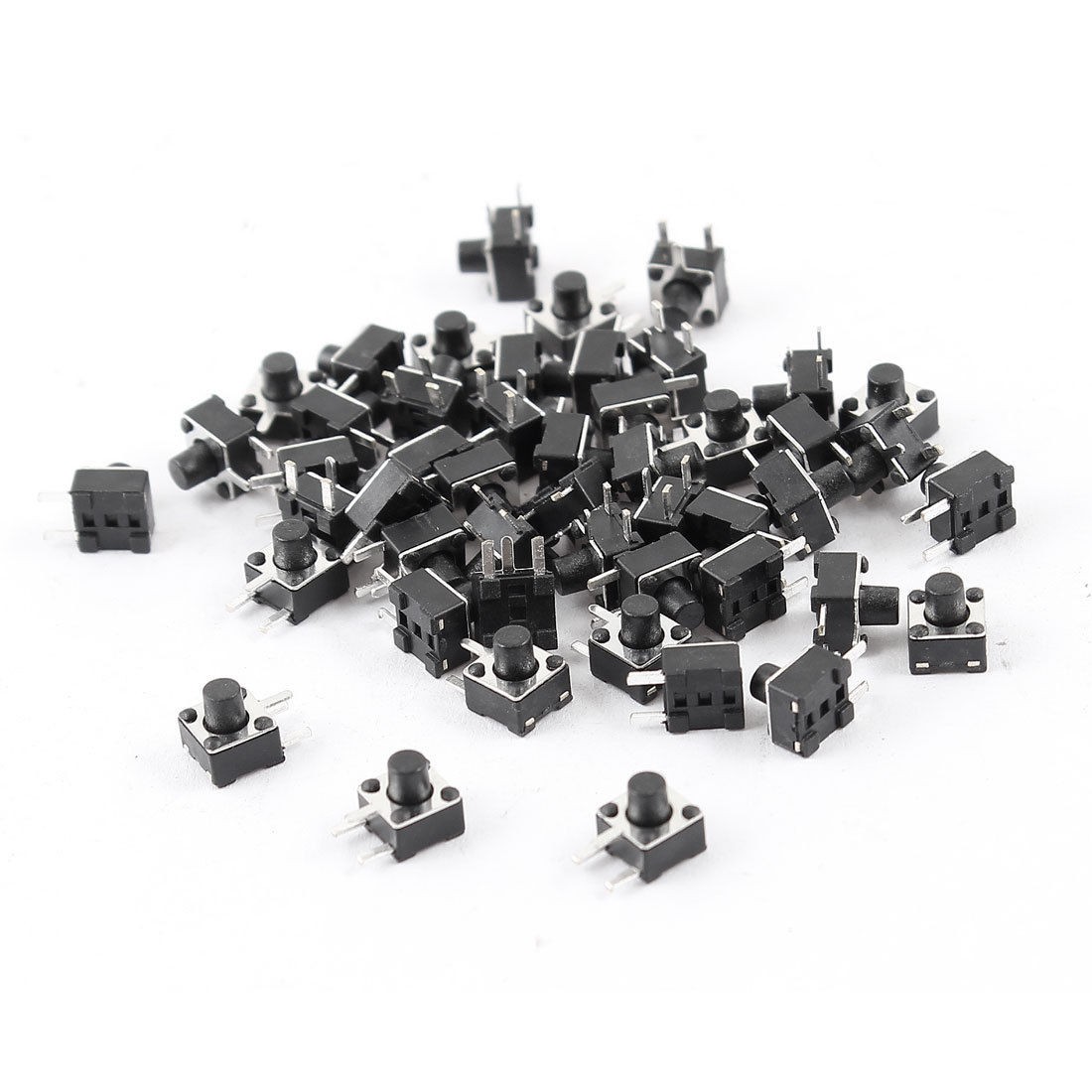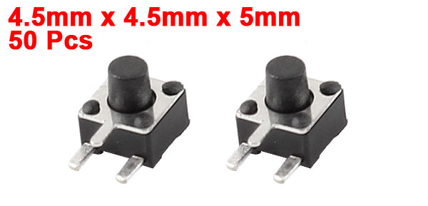 Product Name Tact Switch Type SPST Action Type Momentary Dimension 4.5 x 4.5 x 5mm / 0.18" x 0.18" x 0.2"(L*W*H) Button Dia 2mm / 0.08" Pin Length 1.5mm/0.06" Material Plastic, Metal, Electric Parts Color Black, Silver Tone Net Weight 8g Package Content 50(±2%) x Tact Switch - Reviews