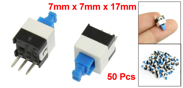 Product Name Push Button Switch Contact Type Momentary Dimension 7 x 7 x 17mm/ 0.28" x 0.28" x 0.67"(L*W*H) Pin Number 3 Material Plastic, Metal Color Blue, Black ,White Weight 17g Package Content 50 Pcs(±2%) x Push Button Switch - Reviews