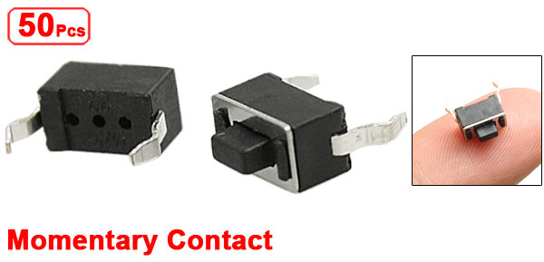 Product Name Tact Switch Quantity 50±2% Pcs Contact Type Momentary Contact Dimension 3 x 6 x 5mm / 0.12" x 0.24" x 0.2" (L*W*H) Button Size 3 x 1.5mm/ 0.12" x 0.06" (L*W) Pin Pitch 6mm / 0.24" Pin Length 5mm / 0.2" Material Plastic, Metal, Electric Parts Color Black, Silver Tone Net Weight 6g Package Content 50 x Tact Switches - Reviews