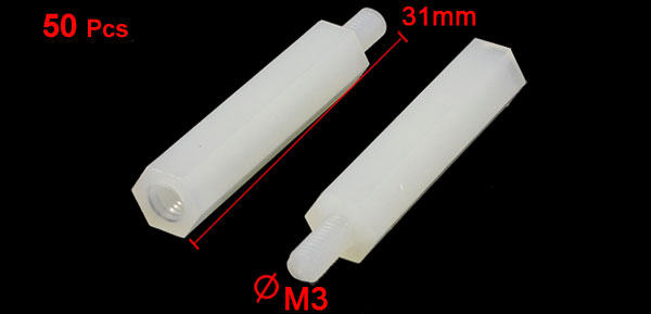 Details50 Pcs Nylon Hex Standoff Spacer Female to Male M3x25+6mm Off White  Product Name Nylon Standoff Spacer Material Nylon Thread Size M3 / 3mm Length 25mm Female + 6mm Male Color Off White Weight 36g Package Content 50 x Nylon Standoff Spacer