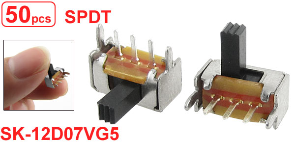 Product Name Slide Switch Model SK-12D07VG5 Action Type SPDT Contact Type ON/ON, 2 Positions Pins Quantity 3 Working Power 0.5A 50V DC Contact Resistance 30mΩ Max Insulation Resistance 100mΩ Min at 500V DC Withstand Voltage AC 500V for 1 min Pin Size(Each One) 3 x 0.5mm/ 0.12" x 0.02"( L * W) Pin Pitch 2mm / 0.079" Main Body Size(not include Pins & Knob) 8.8 x 4.4 x 4.2mm / 0.35" x 0.17" x 0.16" (L * W* H) Switch Total Size 8.8 x 9.5 x 7.5mm / 0.35" x 0.37" x 0.3" (L * W* H) Knob Size 2 x 2 x 5mm/ 0.08" x 0.08" x 0.19" (L * W * H) Material(External) Plastic, Metal Main Color Silver Tone, Black Weight 25g Package Content 50 x Slide Switch - Reviews