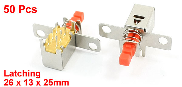 Product Name Push Button Switch Action Type Latching Total Size 26 x 13 x 25mm/1'' x 0.5'' x 1'' (L*W*H) Pin Length 4mm/0.2'' Hole Diameter 3mm/0.1'' Material Plastic, Metal, Electric Parts Color Silver Tone, Black Net Weight 146g Package Content 50(±2%) x Push Button Switches - Reviews