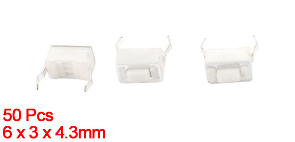 Details50 Pcs PCB Mounting Momentary 2-pin SPST Tact Pushbutton Switch 6x3x4.3mm  Product Name Tact Switch Type SPST Action Type Momentary Pin Number 2 Dimension 6 x 3 x 4.3mm / 0.24" x 0.12" x 0.17"(L*W*H) Button Size 3 x 1.5mm / 0.12" x 0.06"(L*W) Material Plastic, Metal, Electric Parts Color White Net Weight 8g Package Content 50(±2%) x Tact Switch