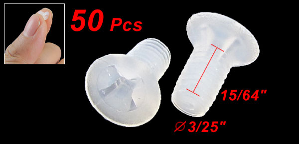 Product Name Screw Type Flat Phillips Head Quantity 50 ± 2%Pcs Thread Length 6mm/ 15/64" Thread Diameter 3mm/ 3/25" Overall Size 6.5 x 5mm/ 0.25" x 0.2" (L*D) Material Plastic Color White Net Weight 3g Package Content 50 x Cross Head Screw - Reviews