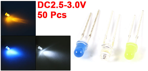 50 Pcs Straw Hat 3mm Yellow White Blue LED Bulb Lamp Emitting Diodes DC 2.5-3.0V