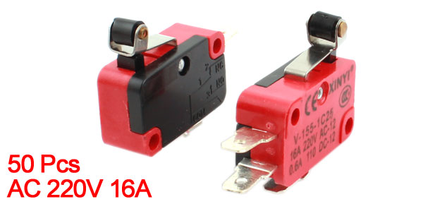 Product Name Micro Switch Model V-155-1C25 Contact Type SPDT(1NO 1NC) Pins 3 Pin Actuator Type Momentary Short Hinge Roller Lever Rating AC 220V 16A Body Size(Each) 28 x 16 x10mm/1.1" x 0.63" x 0.4"(L*W*T) Roller Size 5 x 4mm /0.2" x 0.16" (D*L) Level Length 15mm/0.6" Material Plastic, Metal Switch Color Black, Red Net Weight 349g Package Content 50 Pcs(2%) x Micro Switch - Reviews