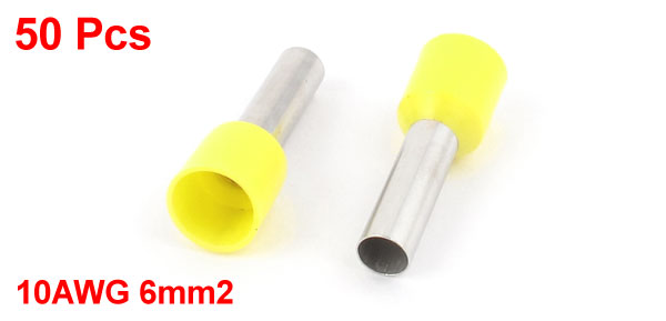Product Name Insulated Ferrule Model E6012 Design Tube Type Material Plastic, Tin Plated Copper Color Silver Tone, Yellow Fit Wire Gauge 10AWG 6mm2 Cooper Tube Size 3.5 x 4 x 12mm / 0.14" x 0.16" x 0.47" (Inner Dia*OD*L) Plastic Part Size 6 x 7 x 8.5mm / 0.24" x 0.27" x 0.33" (Inner Dia*OD*L) Total Length 20.5mm / 0.8" Net Weight 16g Package Content 50 Pcs (+/-2%)x Insulated Ferrules - Reviews