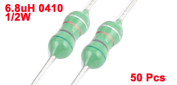 Product Name Fixed Inductor Lead Type Axial Power Rating 1/2W Packaging Type 0410 Inductance Tolerance ± 10% Inductance 6.8uH Total Size (Approx) 6 x 0.35cm / 2.4" x 0.14" (L*D) Main Color Green, Silver Tone Weight 15g Package Content 50(+/-2%) Pcs x Fixed Inductor - Reviews