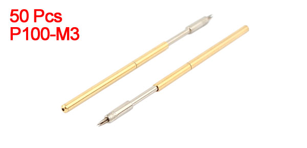 Product Name Test Probe Pin Model No. P100-M3 Tip Type Tri-needle Tip Tip Dia(Approx) 1.5mm/ 0.06" Barrel Dia(Approx) 1.36mm/ 0.054" Overall Length(Approx) 38.3mm/ 1.5" Drill Hole Dia 1.7mm/0.067" Test Distance Min 2.54mm/0.1" Pin Cover Dia 1.67mm/0.066" Material Metal Color Gold Tone, Silver Tone Weigth 14g Package Content 50(±2%) x Test Probe Pin - Reviews