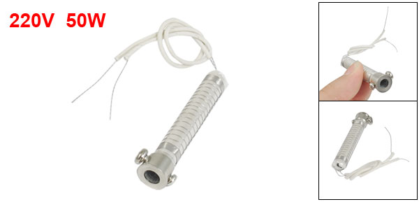 Details50 Watt Metal Heating Element Core Heater for Soldering Iron  Product Name Soldering Heating Element Core Working Voltage 220V Power 50W Electrical Strength 1500V 50Hz Body Size 6 x 1.2cm/ 2.4" x 0.5"(L*Max.D) Cable Length 14cm/ 5.5" Material Metal Color White, Silver Tone Net Weight 11g Package Content 1 x Soldering Heating Element Core