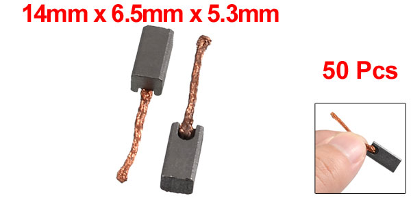 Product Name Motor Carbon Brush Material Carbon, Metal Color Black, Copper Tone Each Carbon Brush Size (Approx) 14 x 6.5 x 5.3mm/ 0.55" x 0.25" x 0.21"(L*W*H) Total Length(Approx) 34mm/ 1.4" (When Lead Straight) Total Weight 62g Package Content 50 x Motor Carbon Brush - Reviews