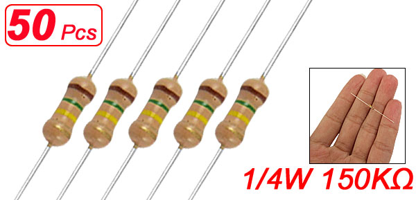 Product Name Resistor Resistor Type Carbon Film Rated Power 1/4 W Resistance Value 150KΩ Tolerance ± 5% Withstang Voltage 250V Body Size (Approx.) 5 x 2mm/0.2'' x 0.08'' (L*D) Lead Diameter 0.3mm /0.01 Total Length 45mm /1.8'' Color As Picture Shown Weight 5g Package Content 10(±2%) x Carbon Film Resistors - Reviews