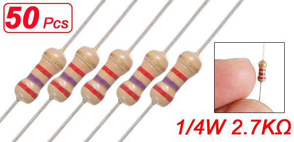 Product Name Resistor Resistor Type Carbon Film Rated Power 1/4 W Resistance Value 2.7K Ω Tolerance ± 5% Withstang Voltage 250V Body Size (Approx.) 5 x 2mm/0.2'' x 0.08'' (L*D) Lead Size (Each End) 20 x 0.4mm / 0.8" x 0.016" (L*D) Total Length 45mm/1.8'' Color As Picture Shown Weight 5g Package Content 50(±2%) x Carbon Film Resistors - Reviews