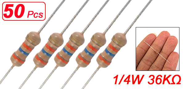 Product Name Resistor Resistor Type Carbon Film Rated Power 1/4 W Resistance Value 36KΩ Tolerance ± 5% Withstang Voltage 250V Body Size (Approx.) 5 x 2mm/0.2'' x 0.08'' (L*D) Lead Diameter 0.3mm /0.01 Total Length 45mm /1.8'' Color As Picture Shown Weight 5g Package Content 50(±2%) x Carbon Film Resistors  - Reviews