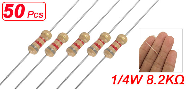 Product Name Resistor Resistor Type Carbon Film Rated Power 1/4 W Resistance Value 8.2KΩ Tolerance ± 5% Withstang Voltage 250V Body Size (Approx.) 5 x 2mm/0.2'' x 0.08'' (L*D) Lead Diameter 0.3mm /0.01 Total Length 45mm /1.8'' Color As Picture Shown Weight 5g Package Content 50(±2%) x Carbon Film Resistors - Reviews