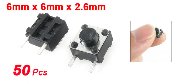 Product Name Tact Switch Contact Type Momentary Contact Quantity 50±2% Pcs Dimension 6 x 6 x 2.6mm / 0.24" x 0.24" x 0.1" (L*W*H) Button Dia. 3mm / 0.12" Pin Pitch 5mm / 0.2" Pin Length 3mm / 0.12" Material Plastic, Metal, Electric Parts Color Black, Silver Tone Net Weight 12g Package Content 50 x Tact Switches - Reviews